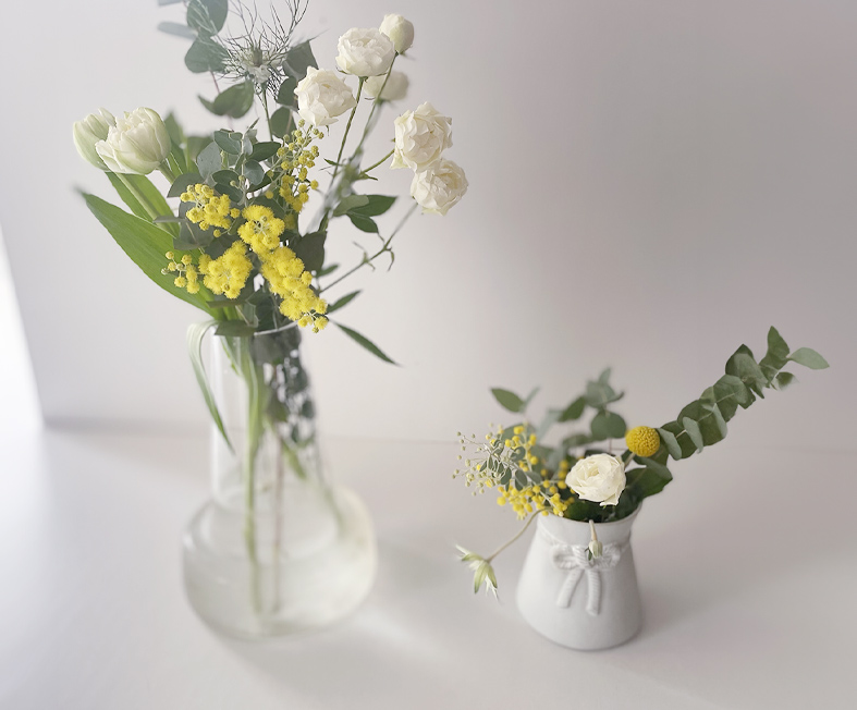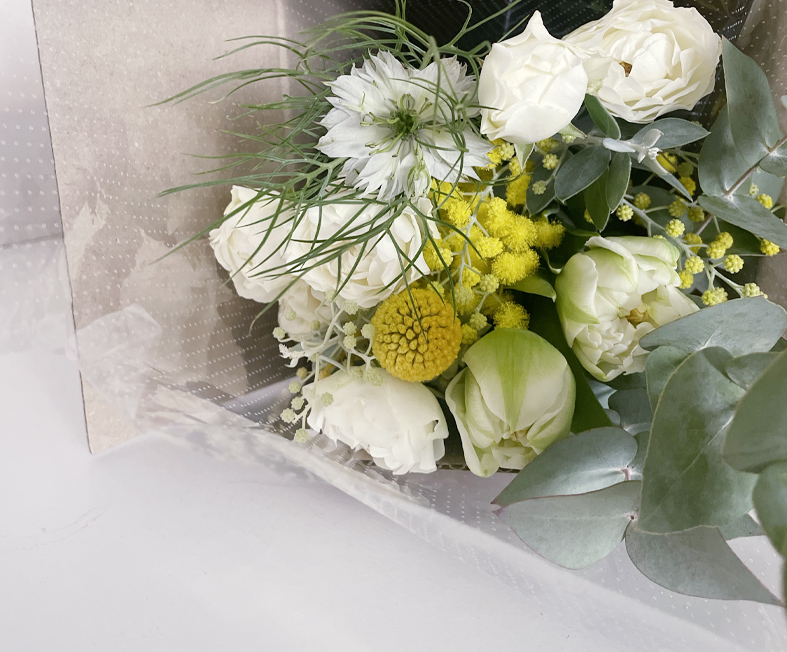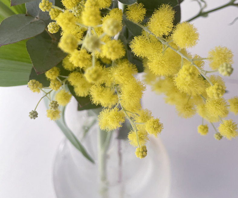 メインのミモザのほかにも、チューリップやバラ、ユーカリなど、いくつもの種類のお花が入っていて、ひとつひとつ表情が違うのも楽しく感じました。