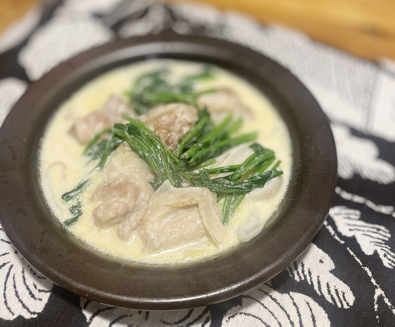 鶏モモ肉、ほうれん草、里芋、玉ねぎ、片栗粉、スライスチーズ