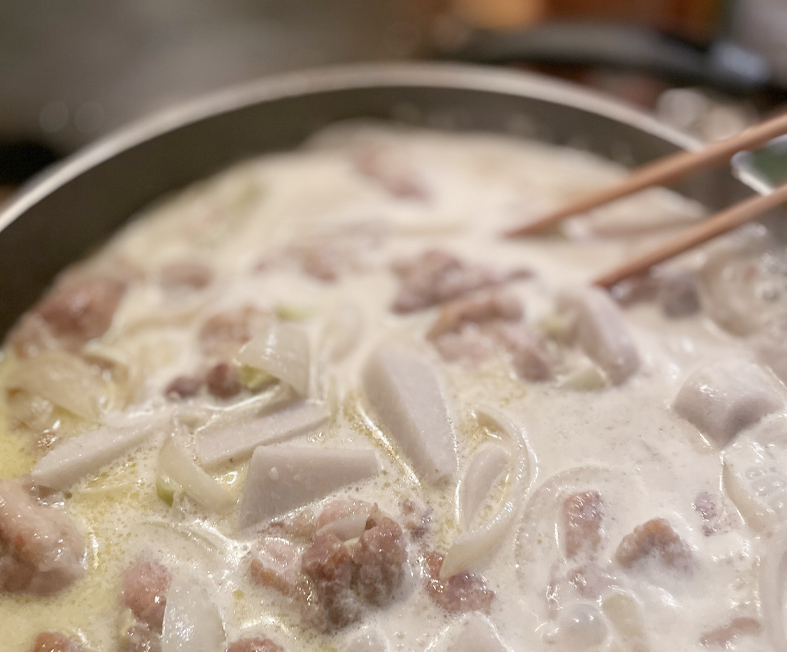・鶏肉に焦げ目がつき、火が通ったらAと里芋、スライスチーズを入れて煮立たせます。