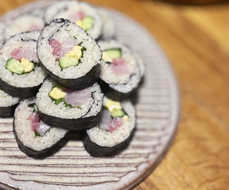 マグロや白身など、いろいろな種類を組み合わせることで、彩りも味わいも豊かな海苔巻きに仕上がります。卵焼きは自宅で手作りします。